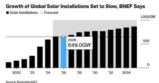 中国市场需求的波动则更加剧烈。按照彭博新能源财经最新预测,中国2026年的光伏部署规模将较2025年下降14%,至341GW,尽管仍稳居全球第一,但增长动能已明显放缓。
