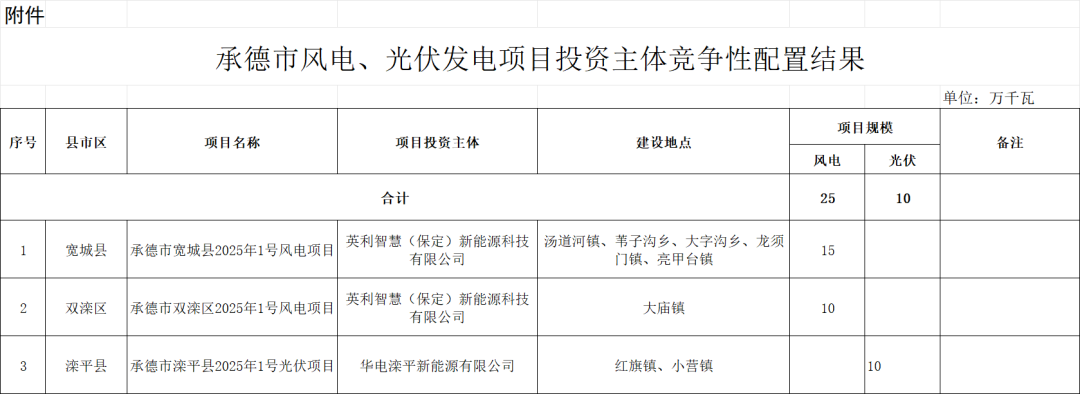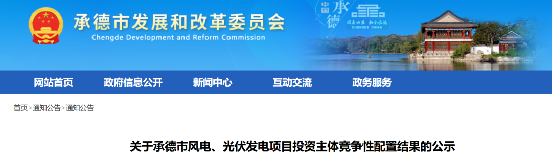 根据河北省发展和改革委员会《关于做好新旧政策交替期内风电、光伏发电项目管理工作的通知》(冀发改能源〔2025〕1232号)、《河北省风电、光伏发电项目开发建设管理办法(试行)》(冀发改能源规〔2025〕9号)及《关于部分项目补充纳入2025年河北省风电光伏项目竞配清单的通知》等文件要求,承德市发展和改革委员会对河北省发展和改革委员会2026年1月19日发布补充纳入2025年河北省风电光伏项目竞配清单的项目,严格按照程序组织完成了投资主体竞争性配置工作,现将本次竞争性配置结果予以公示。
